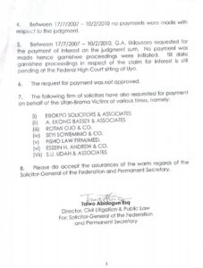 The letter, dated October 20, 2015, confirmed that the N350 million paid to the Utan BRAMA victims was effected with the consent of all parties and served as a full settlement of the judgment long before Chief Aondoakaa assumed office in 2007.