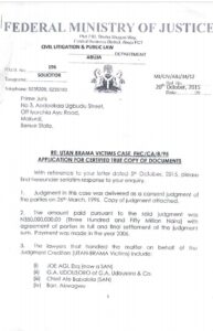 The letter, dated October 20, 2015, confirmed that the N350 million paid to the Utan BRAMA victims was effected with the consent of all parties and served as a full settlement of the judgment long before Chief Aondoakaa assumed office in 2007.